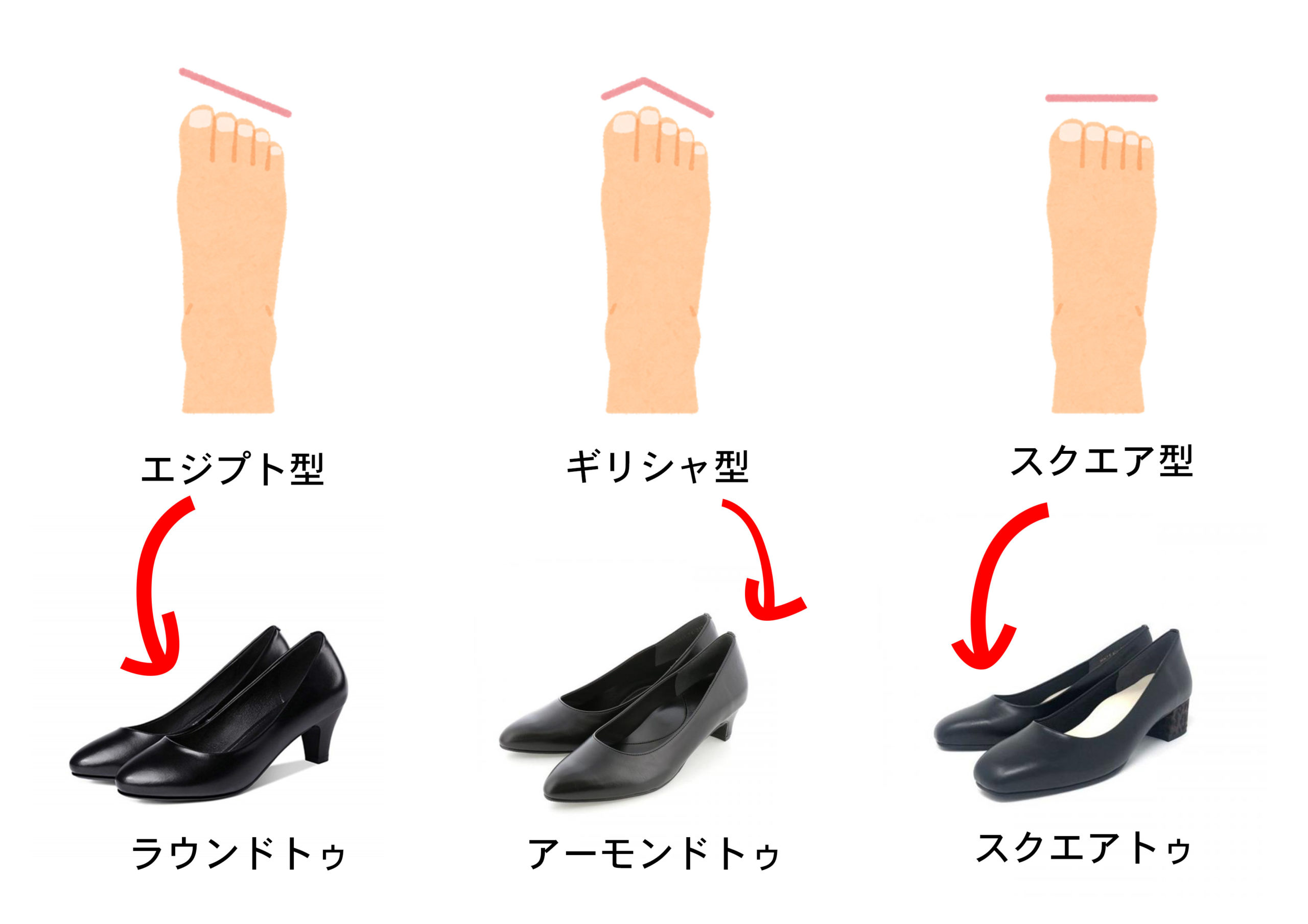 パンプスの形(スクエアトゥやラウンドトゥなど)が色々あるように