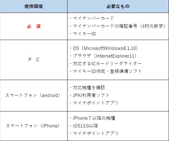 | パソコン | ・OS(MicrosoftWindows8.1,10) ・ブラウザ(InternetExplorer11) ・対応するICカードリーダライター ・マイキーID作成・登録準備ソフト |
