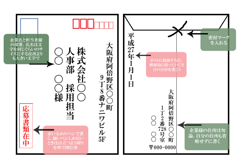 ・封筒は、中の書類よりもまず初めに担当者様の目に入るものです。定規などを使い、きっちりとまっすぐに、キレイに書くことを心掛けましょう。