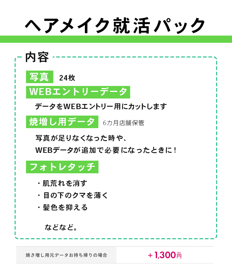 ヘアメイクレッスンのみ→6,600円(税込) ヘアメイクレッスン+就活パック撮影(ヘアメイク付き)→ |