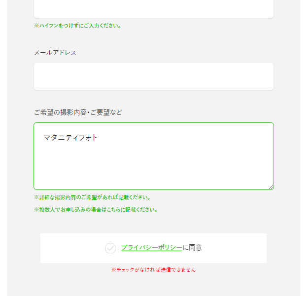 ④ ご希望の撮影内容・ご要望などの欄に「マタニティフォト」とご入力ください。
