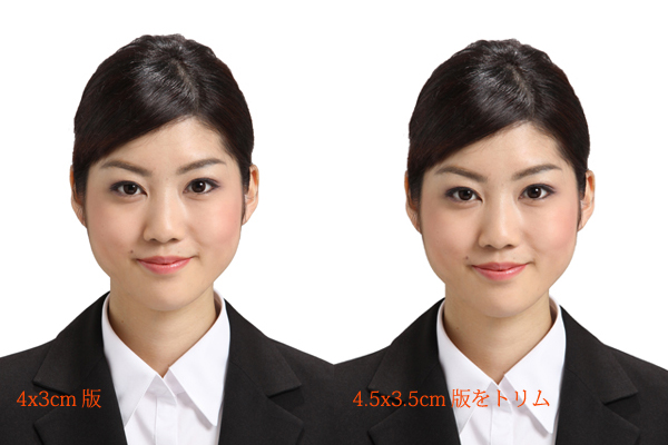 確かに、確かにこれ、サイズは、サイズはあうんですが、あの顔の大きさがめちゃくちゃでかくなっちゃう危険性があります。危険性というか、なります、おそらく確実に。印刷の際、4.5×3.5のサイズに合うよう、お顔の大きさもあわせておりますので、それを縦横0.5cmづつ切っちゃうと、当然余白がなくなって、全面的に顔の大きい写真になっちゃいます。