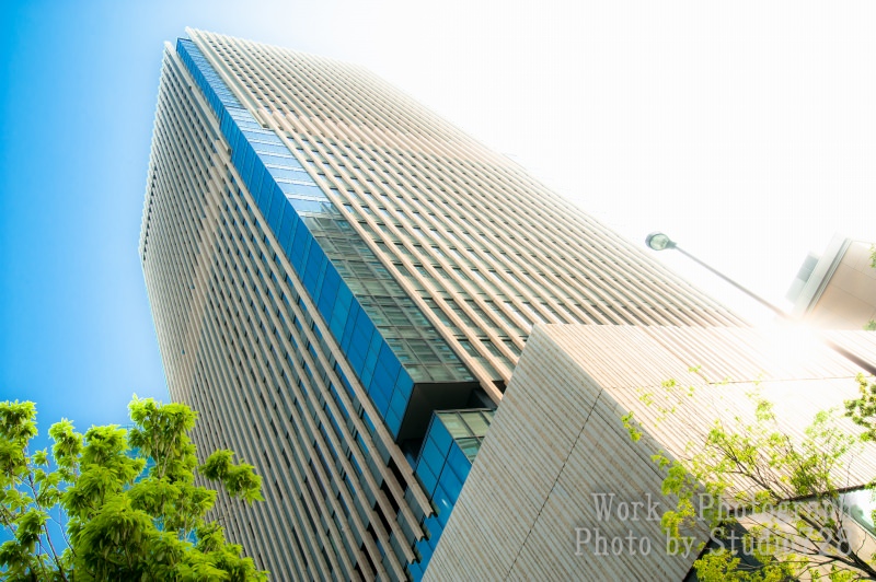 ビルの撮影ではシンメトリーの左右均等+アオリ効果を活かして