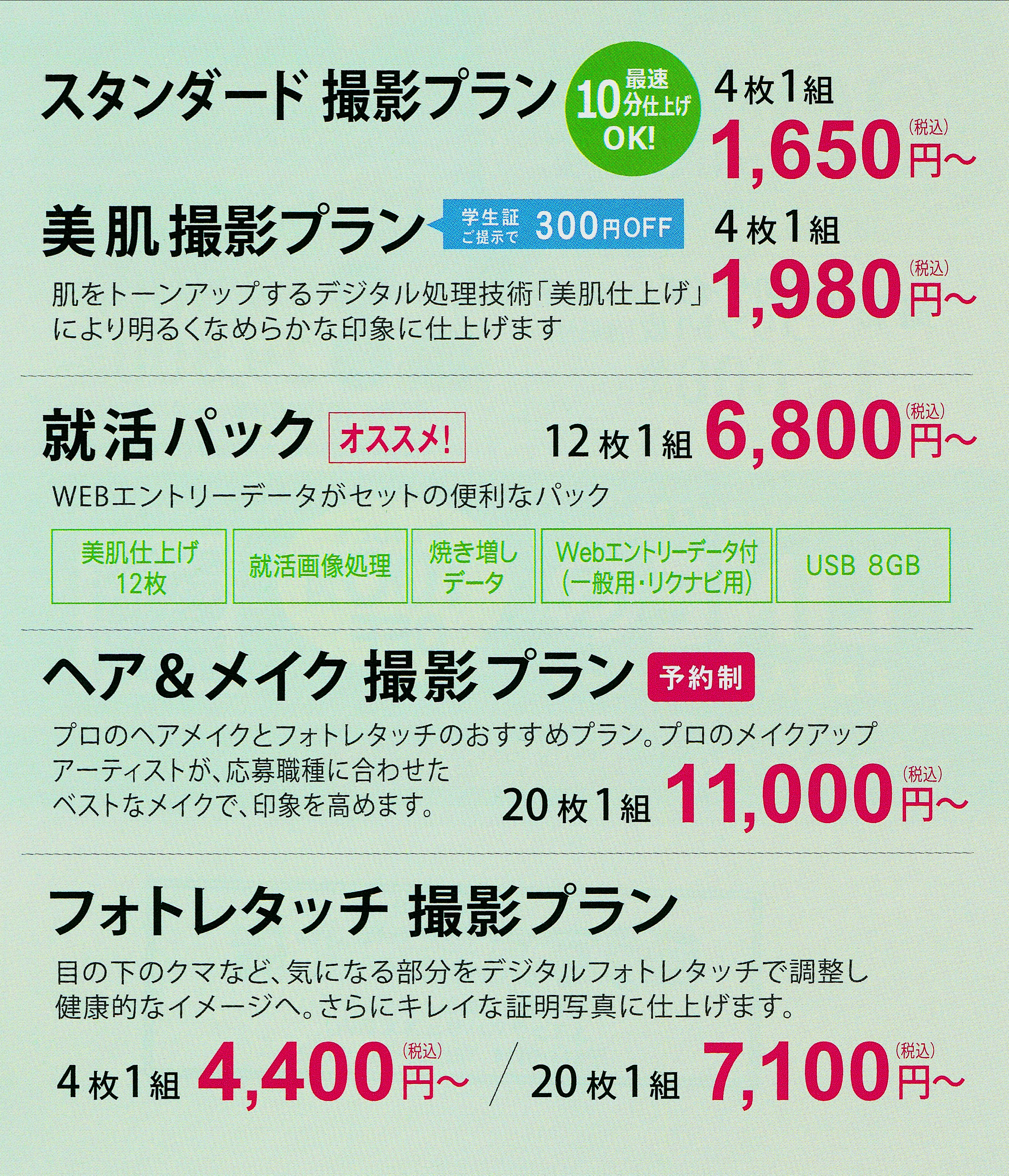 その他にも、昨今の就活には必須にもなっているWEBエントリーデータ付のオススメ「就活パック」や、プロのヘアメイクとフォトレタッチの付いた高印象プラン(要予約)もございます。