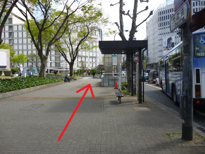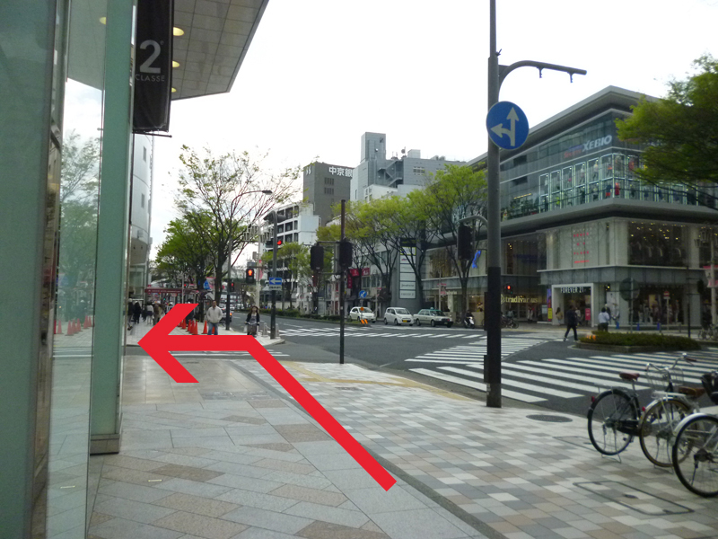 進行方向を変えず車道(大津通)を右手にして信号を渡り、