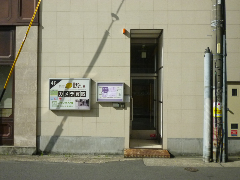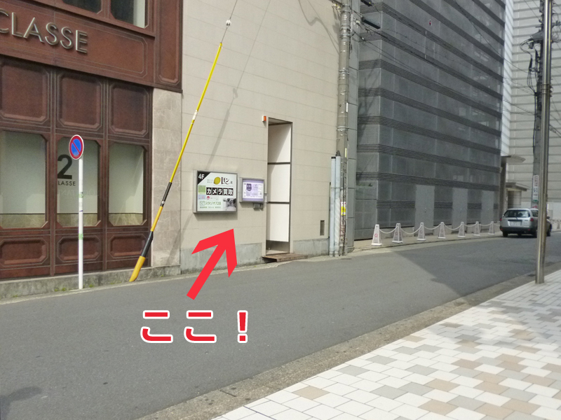左手に角の建物の茶色い外壁のそばに「カメラ買取り」と大きく書かれた当店の看板と出入口が見え、到着です!