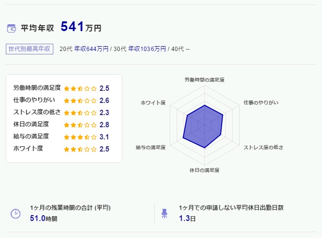 その他、知りたい企業の総合評価をグラフで確認する事も出来ますので、1件1件口コミを確認する必要が無く、一目で企業の評価を知りたい方にオススメです。