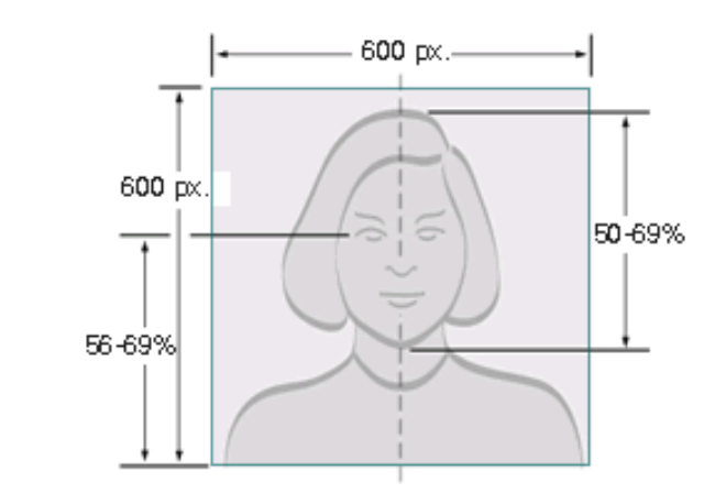 頭髪の頂点からあごまでを測った頭部の長さは、写真全体の縦の長さの50%から70%の間としてください。写真の底辺から目のレベルまでを測った目の高さは、写真全体の縦の長さのの55%から70%、または約2/3としてください。