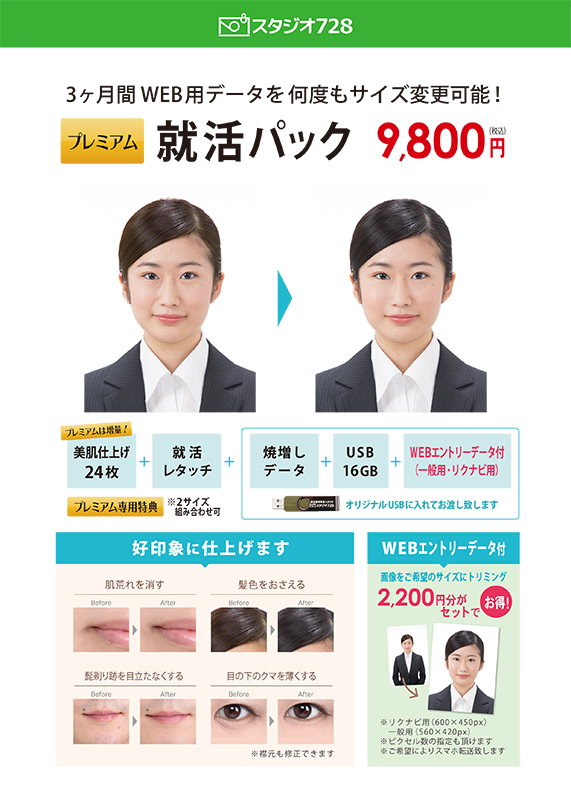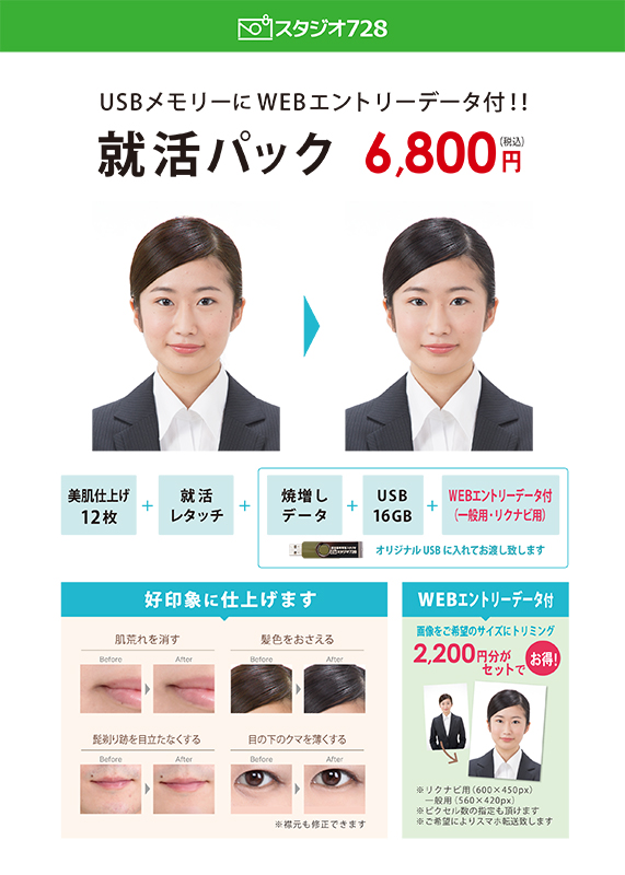 学生さんにとって履歴書に添付する写真はとても重要でありますから、プランを来店前から隅々まで調べて来られる方、来店してから決められる方さまざまですが、やっぱり一番気になるのは代金じゃないですか?だけどいくら安くても必要としてる内容がなくてはかえって高くなります。就活は、一般の証明写真とはちがって写真とWEBデーターも希望される方も多く、生の自分よりもより美しい写真に仕上げてほしいですよねぇ!そんな方のためにスタジオ728では、新プランが登場しました