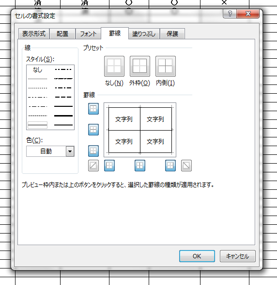 A1セルからドラッグで適当な範囲を選択してホームの罫線から、その他の罫線→内側を選択します。