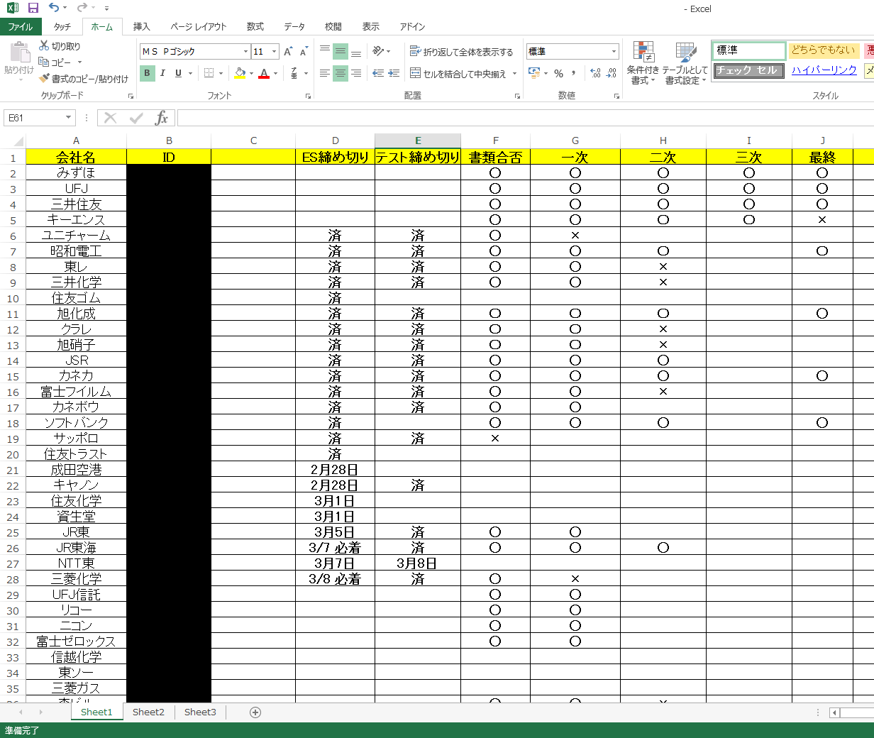 出来た表のA列(右側の縦列)にエントリーする会社名、B列~にID、提出物の締切や進歩状況等を入力していきます。