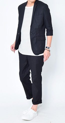 インナーは、Tシャツならば、白またはボーダー柄。Yシャツならば、白または柄物ならチェックがおすすめです。