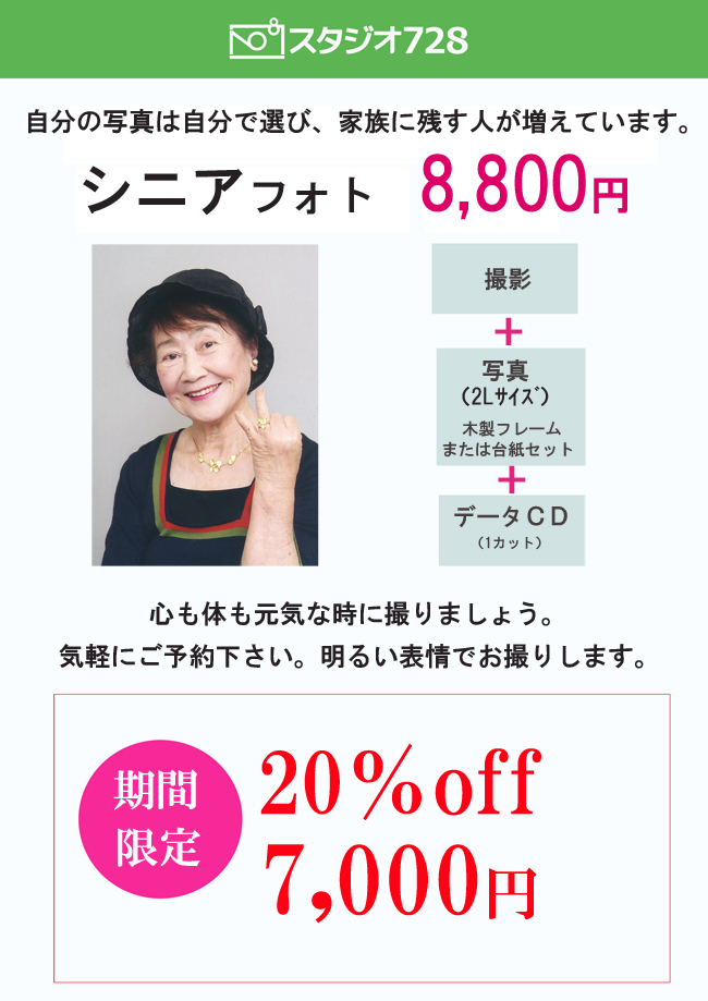スタジオ728千里中央店では、毎日たくさんの老若男女の方に撮影に来て頂いてます。シニアのほとんどの方がセレクトしたお気に入りの画像を見て「この写真を遺影にしようかしら?」とおっしゃいます。