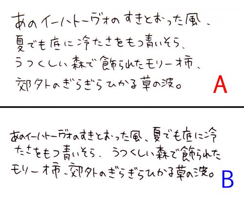 意識しながら書いているのに加えてものさしを添えているので書き出しのから終わりまで文字サイズも大方同じなAに比べ、書き始めは小さいのになぜか徐々に大きくなってきているB。そうなると当たり前ですが行間はガッタガタになります。