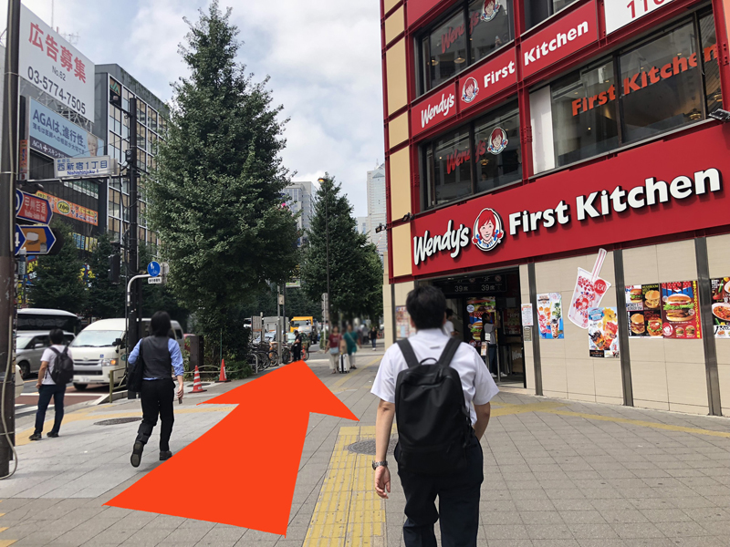 目の前がウェンディーズとファーストキッチンがくっついたハンバーガーショップ。ハンバーガーだけでなく、パスタも食べられるのだとか。この赤い建物の方に渡り、店を右目にまっすぐ歩いていきます。