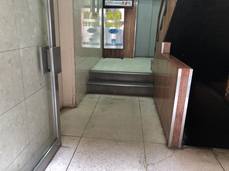 さて、ここまで無事にたどり着けたお客様への最終難関が入り口の場所なのですが、このダイコクドラッグの入り口を左手に少し行くと、黄色い120cm位の看板が看板が座しているこの、いかにもな雑居ビルの入り口が当店のいりぐちでございます。